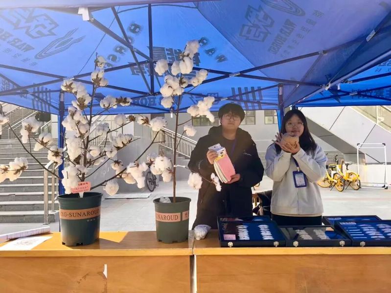 洁白如雪的新疆长绒棉与精致棉制品相映成趣,不少同学在这里第一次了解到“一朵棉花的旅程”。亲手触摸长绒棉的瞬间,有人忍不住感叹:“这分明是大地馈赠的云朵!”